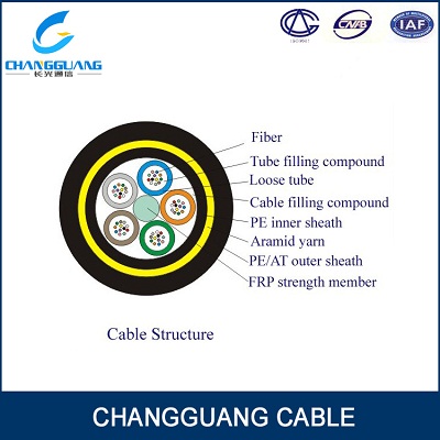層絞式結構:光纖松套管以一定的節距繞制在中心加強件(一般為FRP)上后擠制內護套(在小張力和小跨距時可省略),然后根據所需要的抗拉強度繞包合適的紡綸紗,再擠制PE或AT護套。纜芯可填充油膏,但當ADSS工作在較大跨距并帶有較大弧垂的狀況下,由于油膏的阻力較小,纜芯易“滑動”,松套管節距易發生變化。用合適的方法把松套管固定在中心加強件上和干式纜芯可以克服,但有一定的工藝難度。層絞結構易獲得安全的光纖余長,雖然直徑和重量相對稍大,在中大跨距應用時較有優勢。