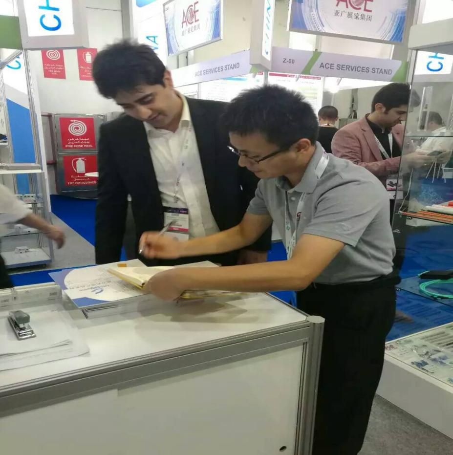 在展會(huì)期間,我們的員工接待了幾百名來(lái)自各國(guó)的客戶,并耐心回答了客戶的每一個(gè)問(wèn)題,下面是現(xiàn)場(chǎng)的一些圖片。例如下圖的客戶就對(duì)他們并不太懂的電力光纜OPGW和ADSS很感興趣,我們的小伙伴正耐心講解。